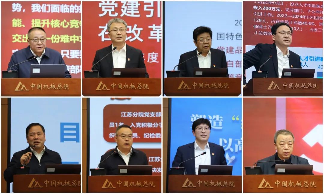 中機一院、機電所、中機認檢、基礎(chǔ)院、輕量化院、江蘇分院、寧波機床院、云南院等8家單位黨組織書記現(xiàn)場述職。王德成結(jié)合黨組織書記現(xiàn)場述職和日常工作情況,逐一提問和點評,肯定了亮點成績、指出了存在問題、提出了意見建議。集團黨委委員分別進行簡要點評。